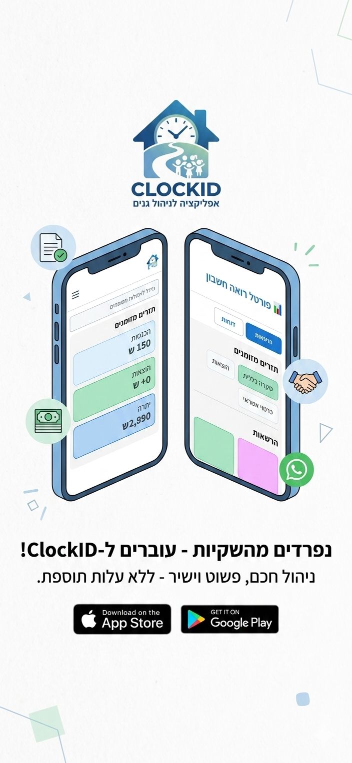 מפעילות ומפעילי גנים ומעונות, נמאס לכם מהניירת?קלוקיד משנה את חוקי המשחק! ⏰📄 מוזמנים להגיד שלום (ולא להתראות!) לשקיות הניילון ולמעטפות המלאות בקבלות. ✅ מעכשיו ב-ClockID – אפליקציה לניהול גני ילדים: ניהול חשבון אישי, הצגת קבלות והחלפת אמצעי תשלום בקלות. ניהול תזרים מזומנים מלא (הכנסות/הוצאות ומצב חשבון בנק). סריקת מסמכים, איסוף חשבוניות מהמייל, קובץ, צילום – … להמשך קריאה